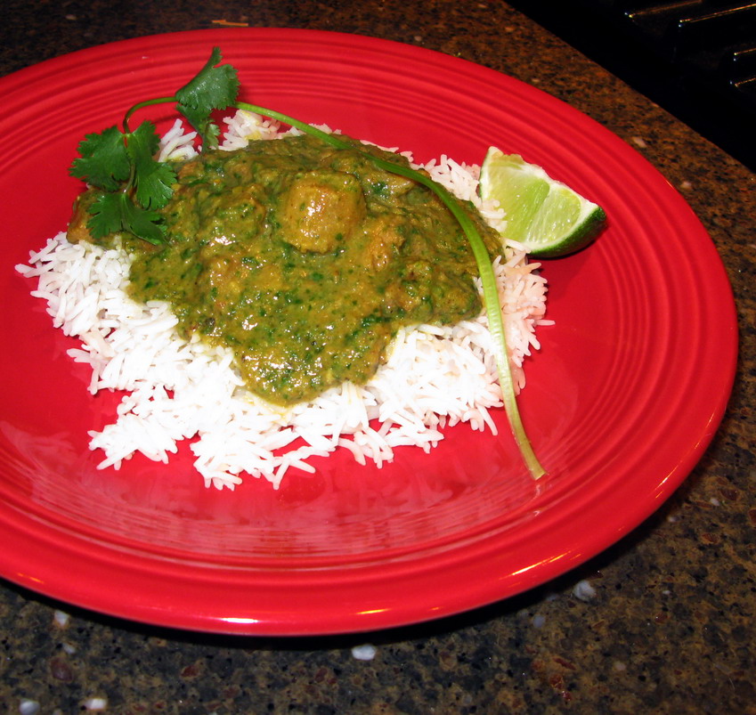 This is a lamb curry that should only be made and eaten by lovers of cilantro, because the main flavoring is–I bet you can’t guess this–cilantro.