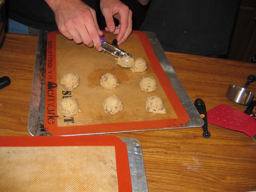 Scoop with a small cookie scoop onto cookie sheets lined with silpats, and bake for 10 minutes. Allow to sit on sheets for three minutes, then remove to racks to finish cooling.