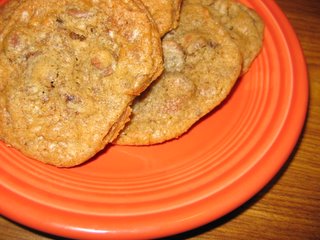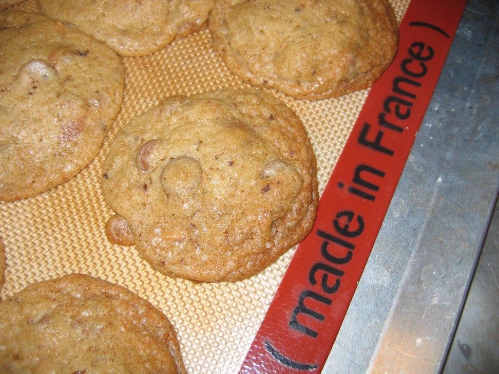 Because of the toffee bits in these cookies, they are crisp on the outside, and chewy on the inside, and they tend toward the fragile. Let them cool for at least two or three minutes on the cookie sheet before removing them to a rack. Otherwise, they are apt to fall apart or droop between the wires of the rack and deform into rather ugly sculptures. I also tend to take them out of the oven when they are slightly underdone, because I want them to finish baking on the sheet. This ensures that the centers stay chewy while the outer layer is still crisp. If you let them darken all the way, they will come out crunchy–it is the extra sugar from the toffee that seems to cause all of this finicky behavior.
