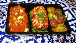 So, here we are, starting out with our new Appetizer Trio: from the left to the right, muhammara, the sexiest dip in existence, made with sweet and hot peppers, walnuts, caramelized onions, garlic and pomegranate molasses, then topped with pistachios. Then we come to my newest innovation which I call Chevre a l’Aziz: a sweet, tart and spicy mixture of the finest tangy goat cheese, dates, spices and pomegranate molasses, rolled in spiced candied pecans and Aleppo Pepper. The final section of the plate contains a mixture of Greek and Italian olives marinated in garlic, preserved lemons, herbs, spices, lemon juice, and olive oil.